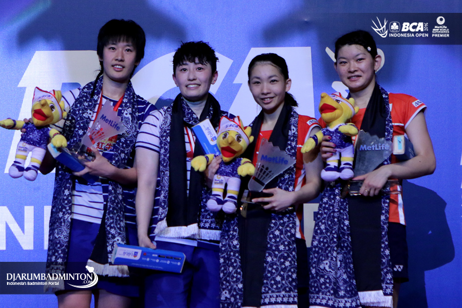 Tang Yuanting/Yu Yang (Tiongkok) dan Ayaka Takahashi/Misaki Matsutomo (Jepang) di podium
