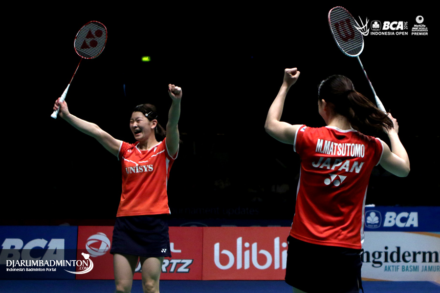 Selebrasi kemenangan Ayaka Takahashi/Misaki Matsutomo (Jepang)