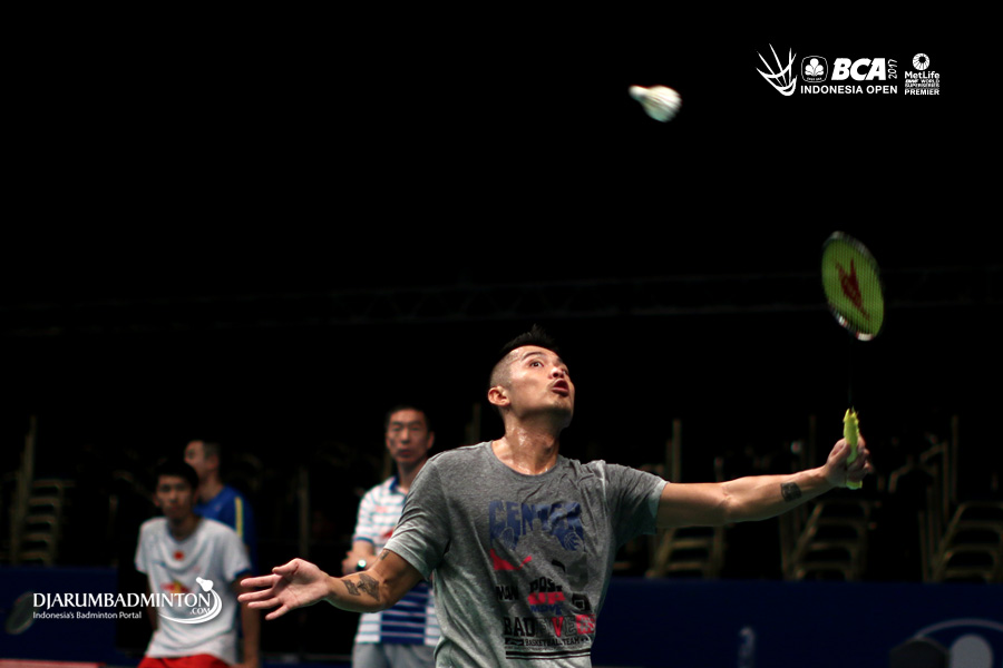 Lin Dan (Tiongkok) mengembalikan shuttlecock