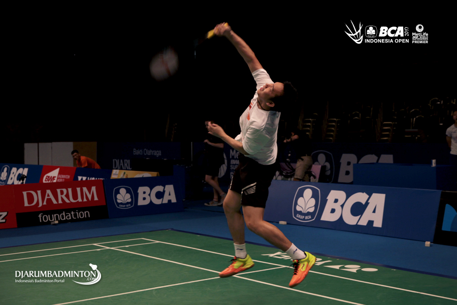 Hendra Setiawan (Indonesia) melepaskan smash