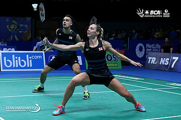 Chris Adcock/Gabrielle Adcock (Inggris) menghadang serangan