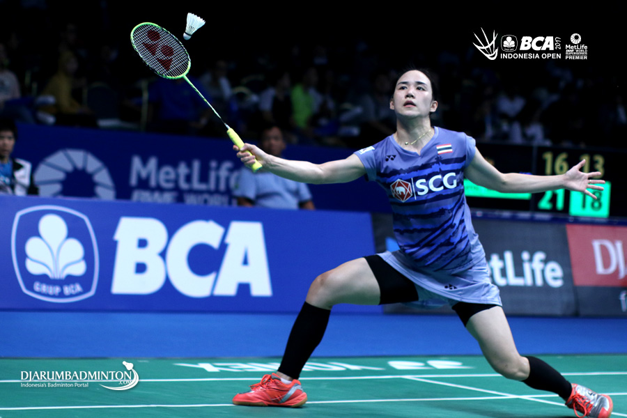 Nitchaon Jindapol (Thailand) bersiap menyambar pengembalian tanggung