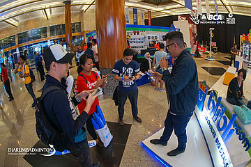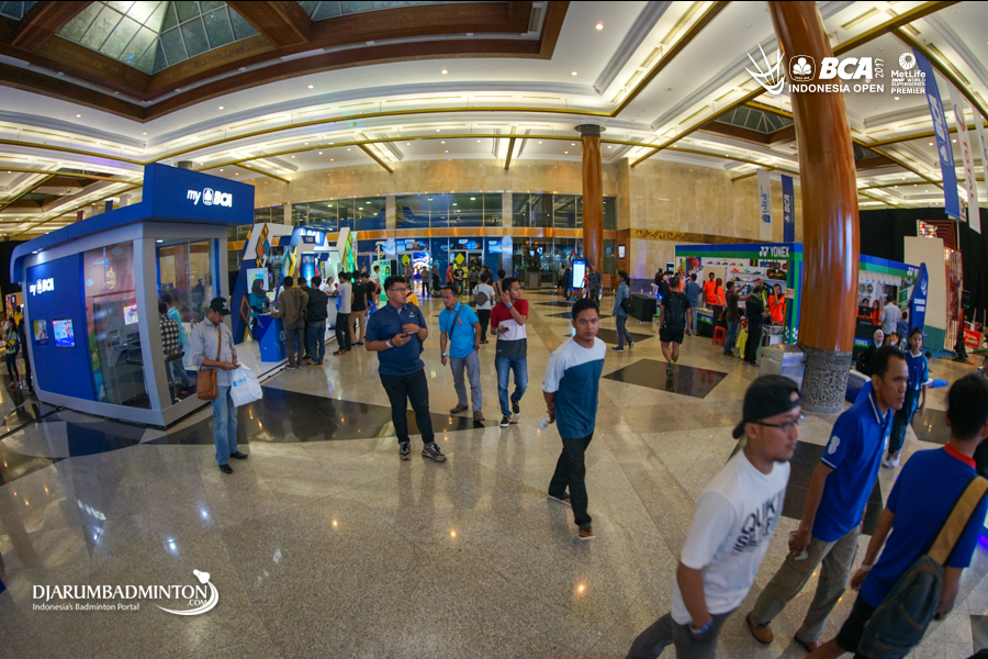 Pengunjung memilih perlengkapan badminton di booth Yonex