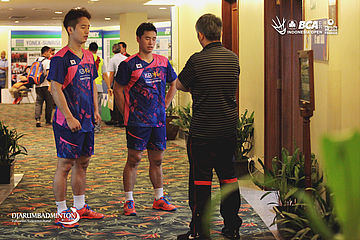 Kim Duk Young dan Choi Solgyu (Korea) mendapat pengarahan dari pelatih seusai pertandingan