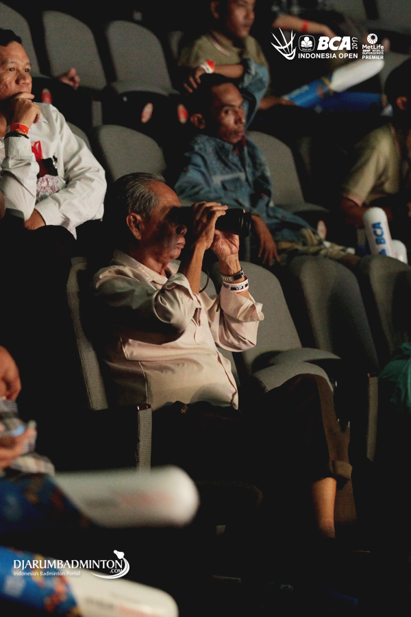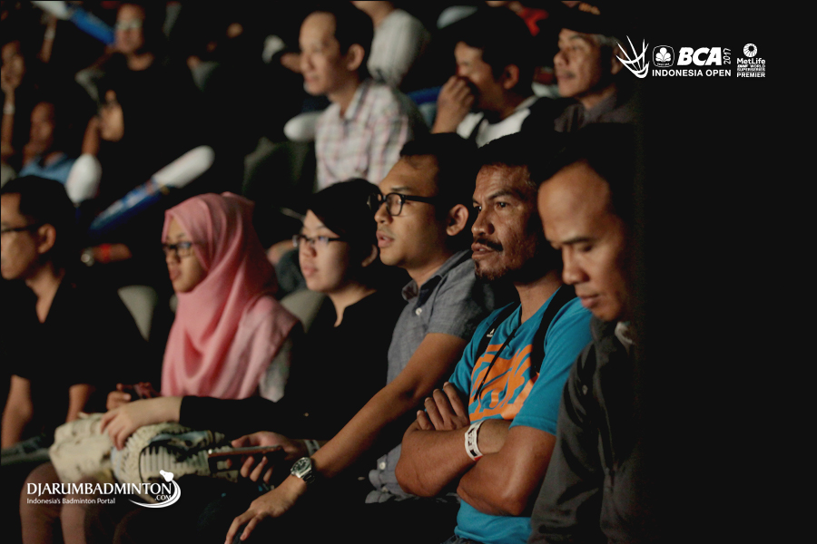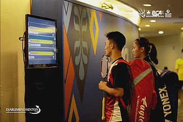 Pebulutangkis ganda campuran asal Indonesia memperhatikan score pertandingan yang sedang berlangsung