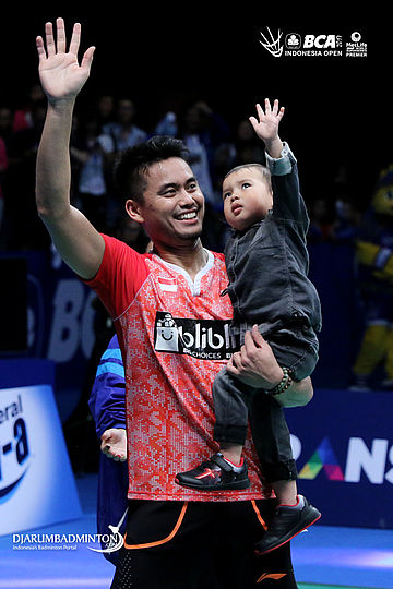 Selebrasi kemenangan Tontowi Ahmad (Indonesia) bersama putranya