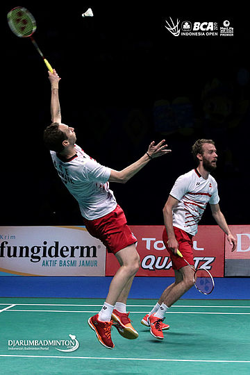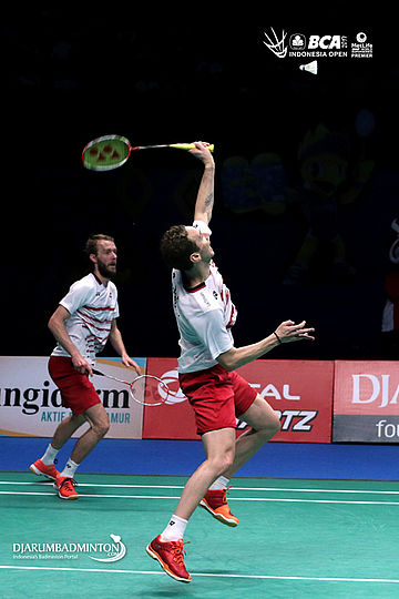 Mathias Boe/Carsten Mogensen (Denamark) bersiap menyambar pengembalian