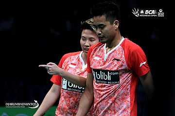 Tontowi Ahmad/Liliyana Natsir (Indonesia) saling berkoordinasi di lapangan