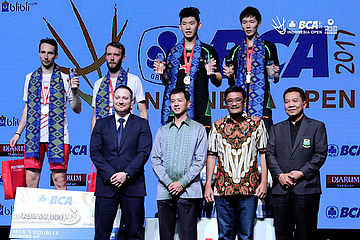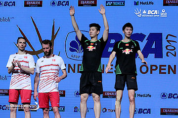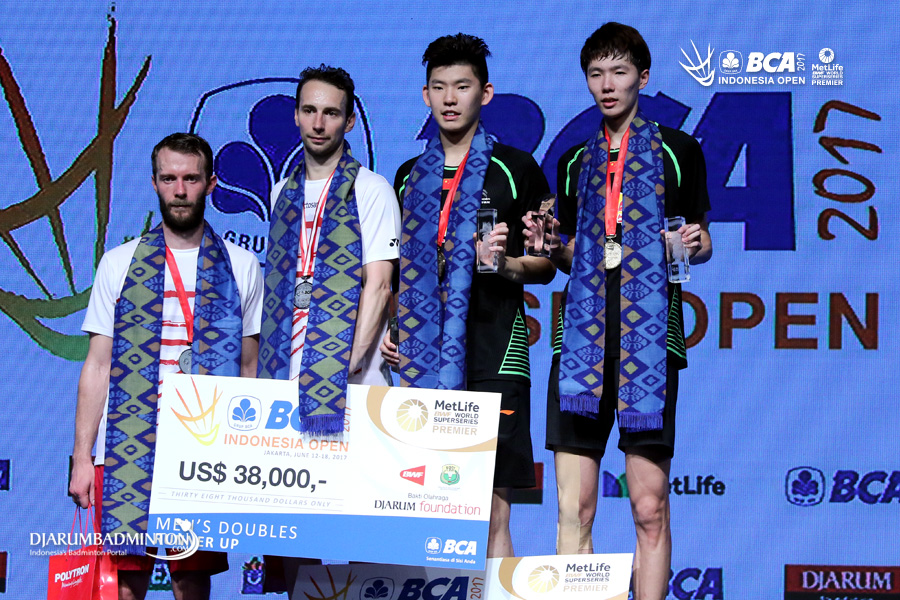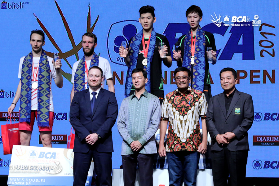 Runner up Mathias Boe/Carsten Mogensen (Denamark) dan juara ganda putra BCA Indonesia Open Superseries Premier 2017, Li Junhui/Liu Yuchen (Tiongkok) berfoto bersama di podium