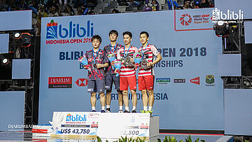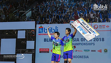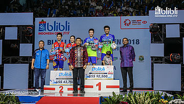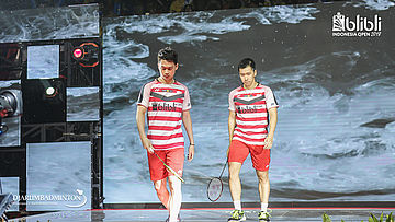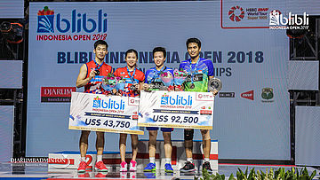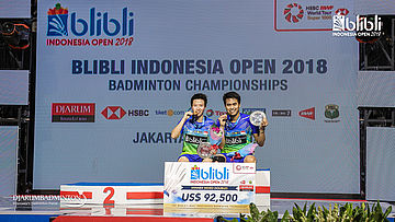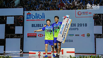 Para juara ganda putra pada BLIBLI Indonesia Open 2018 berfoto bersama
