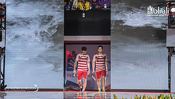Marcus Fernaldi Gideon dan Kevin Sanjaya Sukamuljo (Indonesia) saat memasuki lapangan