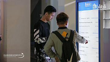 Dua Pengunjung sedang melihat informasi pertandingan di booth informasi