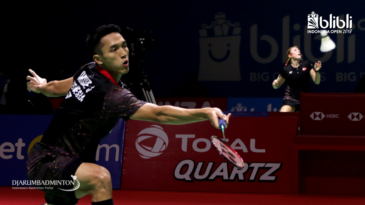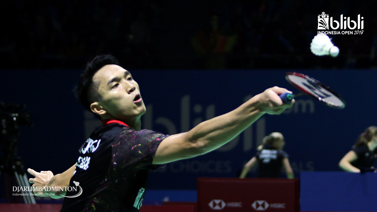 Jonatan Christie (INA) melepaskan serangan