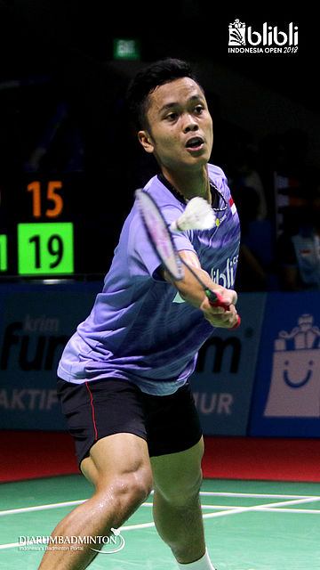 Anthony Sinisuka Ginting (INA) mengembalikan shuttlecock