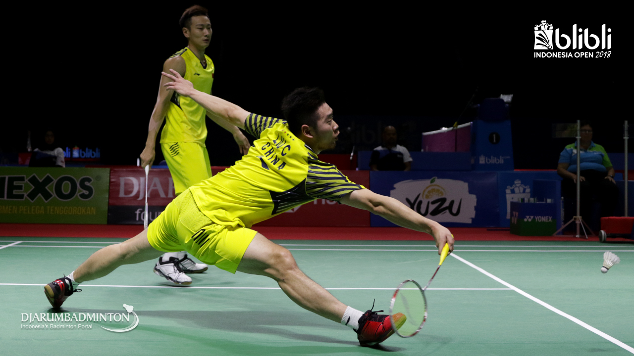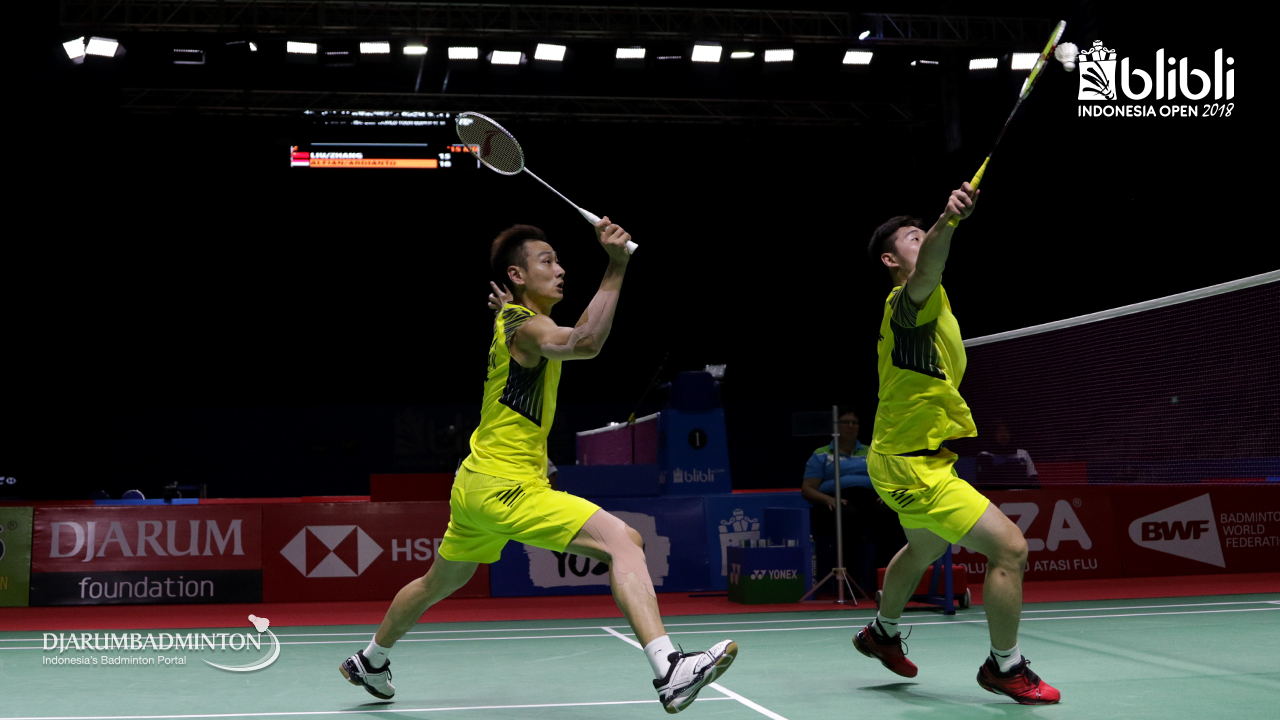 Liu Cheng/Zhang Nan (CHN) mengembalikan shuttlecock.
