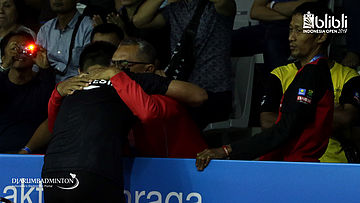 Hafiz Faizal (INA) memeluk ayahnya usai memenangkan pertandingan.