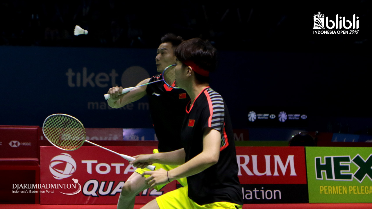 Zhang Nan/Li Yinhui (CHN) bersiap menghadang serangan.