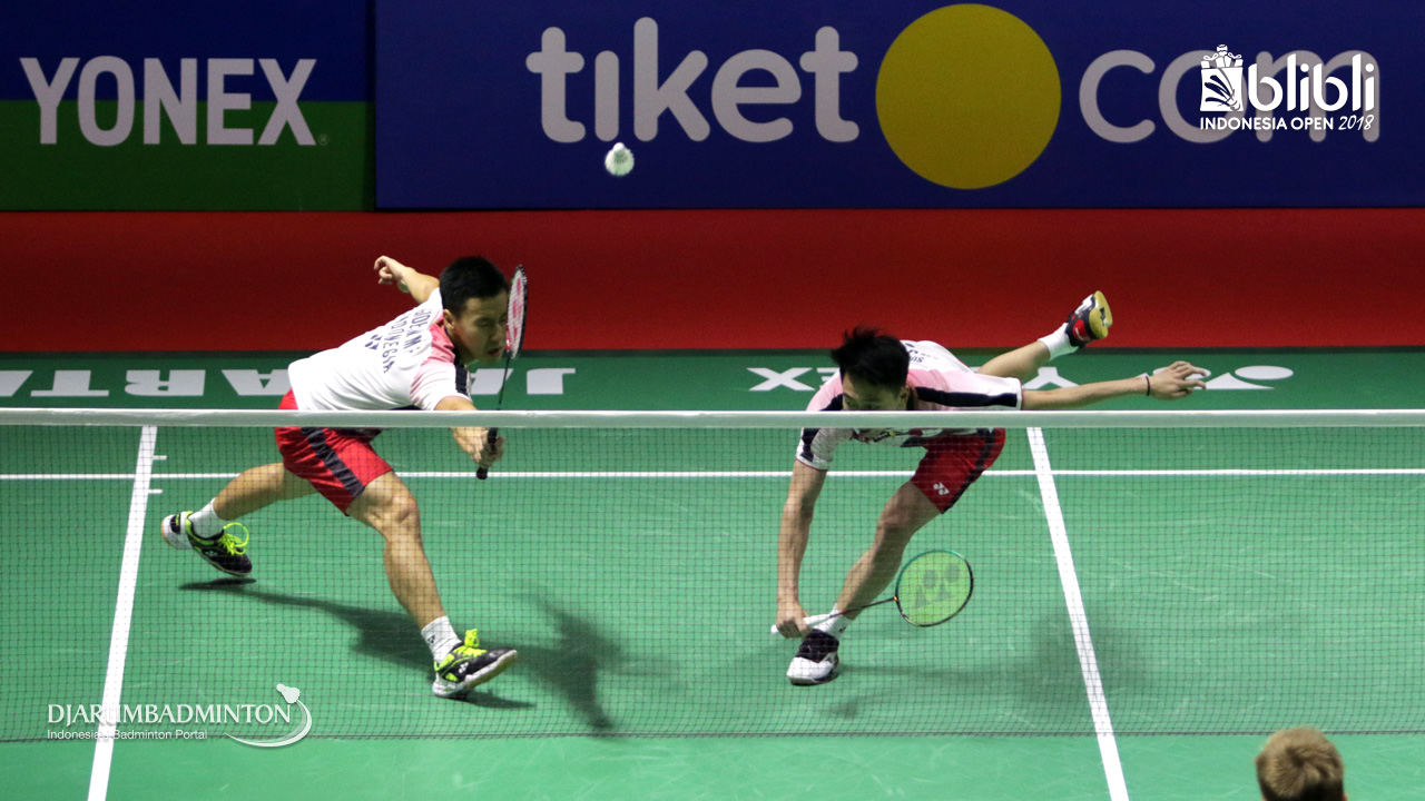 Marcus Fernaldi Gideon/Kevin Sanjaya Sukamuljo (INA) menghadang serangan.