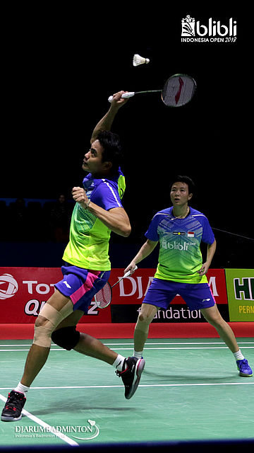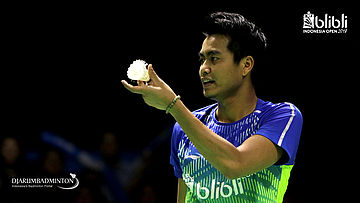 Tontowi Ahmad (INA) meminta pergantian shuttlecock
