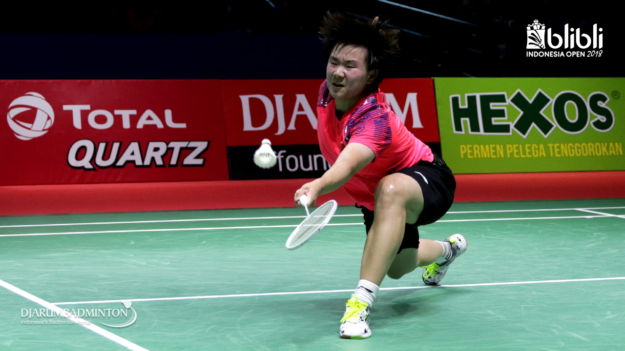 He Bingjiao (CHN) mengembalikan shuttlecock