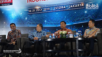 Susy Susanti, Gloria Emanuelle Widjaja, Wiranto, dan Kevin Sanjaya Sukamuljo Berfoto Bersama Maskot Blibli Indonesia Open 2019