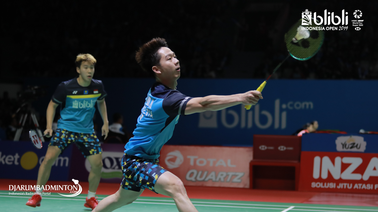 Marcus Fernaldi GIDEON/Kevin Sanjaya SUKAMULJO (Indonesia) mengembalikan serangan