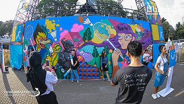 Salah seorang sedang membuat mural di area Blibli Indonesia Open 2019