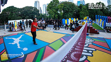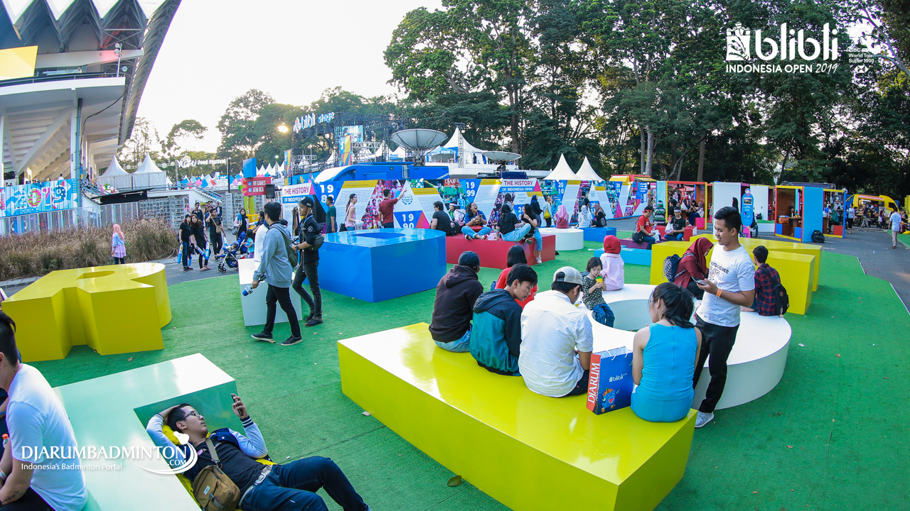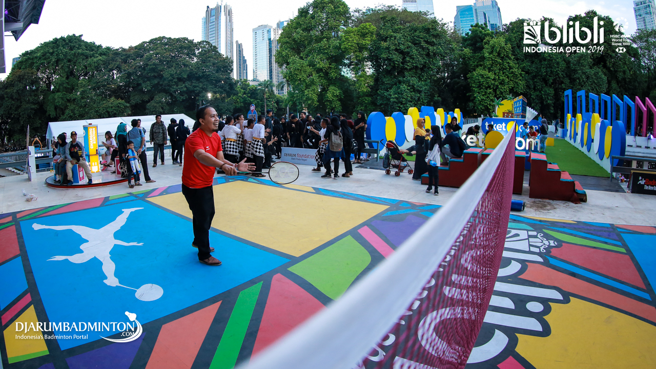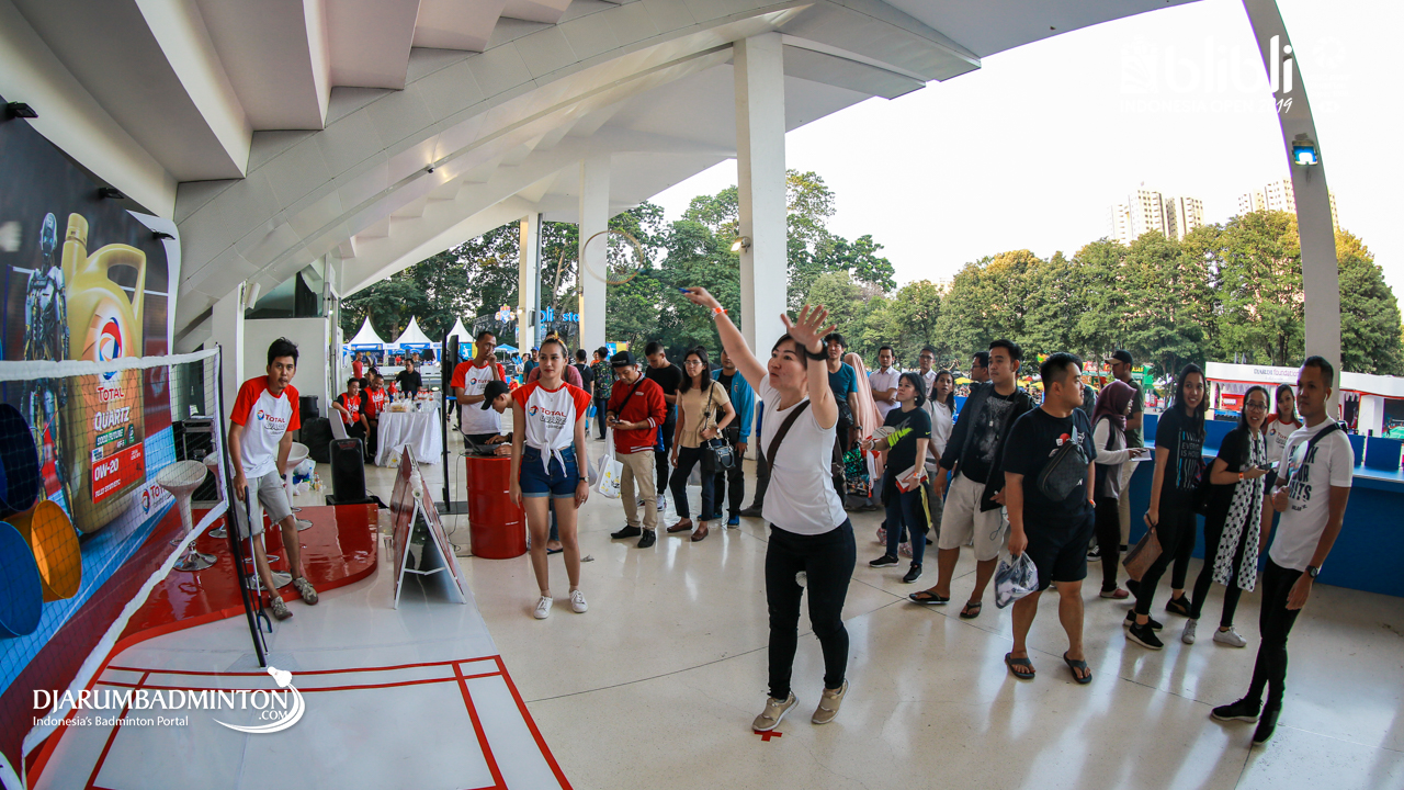 Seorang pengunjung sedang mencoba permainan yang disediakan Blibli Indonesia Open 2019