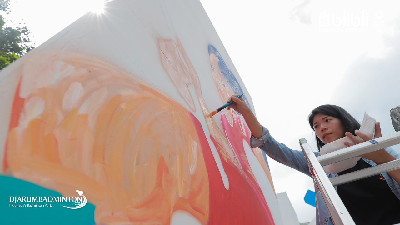 Salah seorang sedang membuat mural di area Blibli Indonesia Open 2019