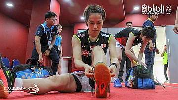 Misaki Matsutomo melakukan pemanasan di Players Services
