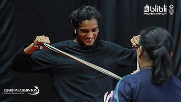 Pusarla V Sindhu melakukan pemanasan di Warming Up Hall