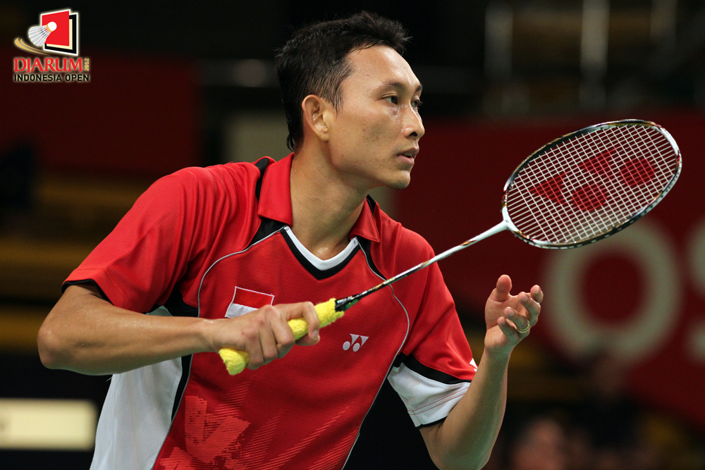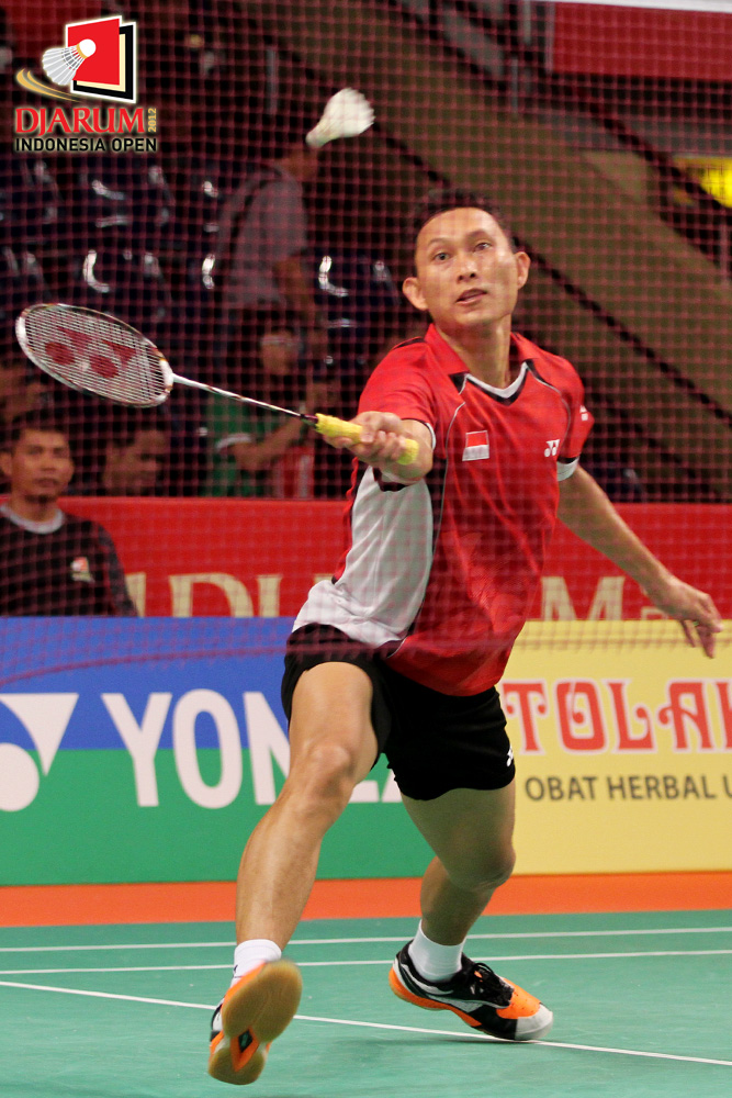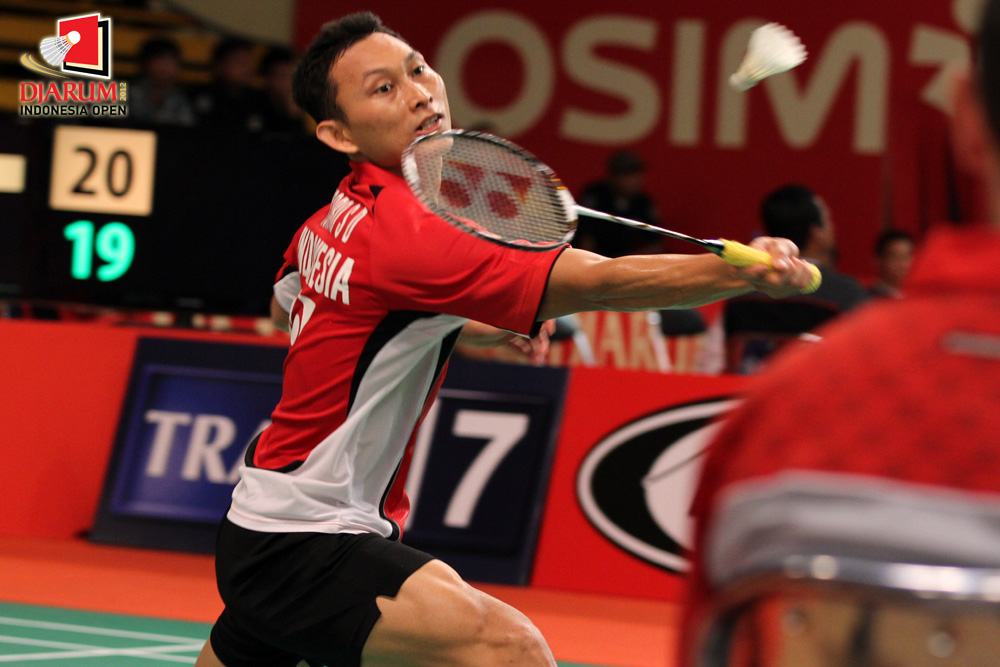Pemain Indonesia, Sony Dwi Kuncoro berusaha mengembalikan kok ke arah pemain India, Anand Pawar di babak kualifikasi pertama Djarum Indonesia Open 2012.