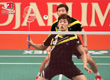 Pasangan Korea Selatan, Jae Sung/Lee Yong Dae berusaha mengembalikan kok ke arah pasangan Indonesia Hendra Setiawan/Markis Kido.