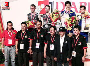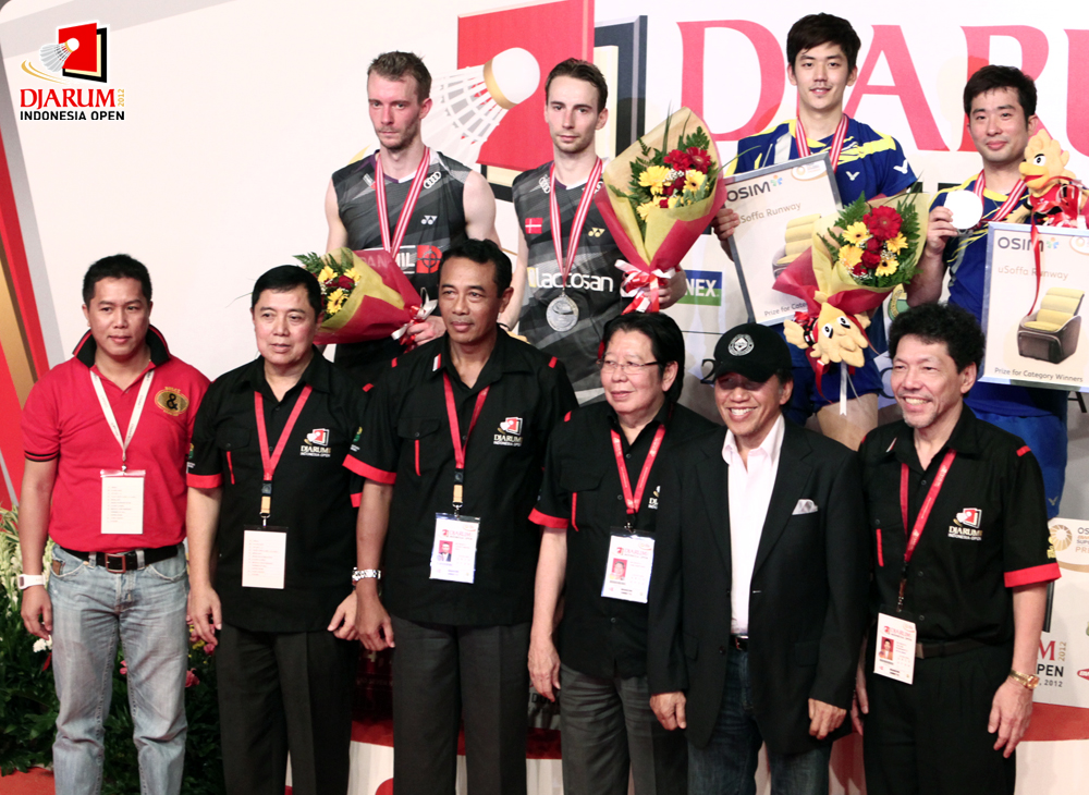 Pasangan Korea Selatan, Jung Jae Sung/Lee Yong Dae dan pasangan Denmark, Carsten Mogensen/Mathias Boe berpose bersama panitia Djarum Indonesia Open 2012.