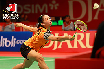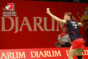 Kaori Imabeppu (Jepang) mengembalikan shuttlecock ke arah Yu Sun (China).