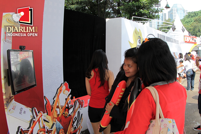 Salah satu pengunjungn saat menikmati sarana photobooth yang tersedia di booth Djarum Official Merchandise.