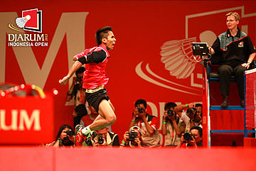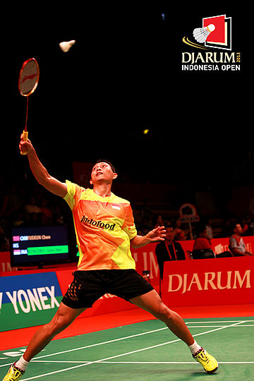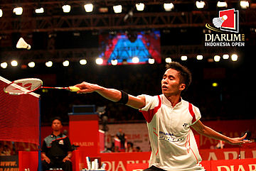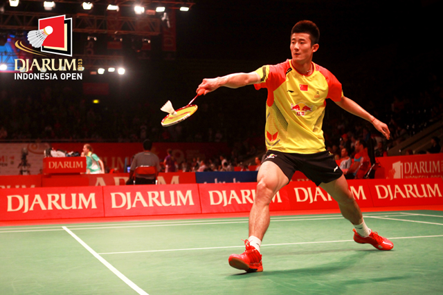 Chen Long (China) mengembalikan shuttlecock ke arah Tommy Sugiarto (Indonesia).