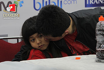 Taufik Hidayat mencium buah hatinya saat press conference.