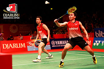 Mohammad Ahsan/Hendra Setiawan (Indonesia) mengembalikan shuttlecock ke arah Hiroyuki Endo/Kenichi Hayakawa (Jepang).