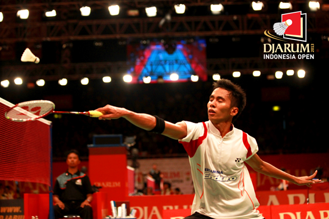 Tommy Sugiarto (Indonesia) mengembalikan shuttlecock ke arah Chen Long (China).