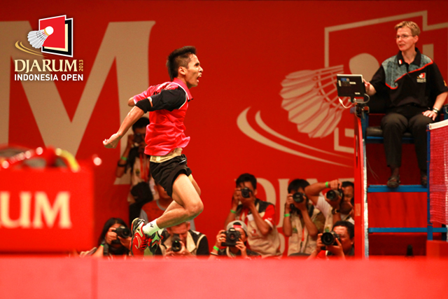 Sony Dwi Kuncoro (Indonesia) melepaskan smash ke arah Yuekun Chen (China).