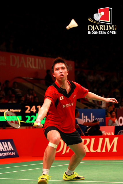 Kenichi Tago (Jepang) terlihat cukup tenang untuk mengembalikan shuttlecock ke arah Alamsyah Yunus (Indonesia).