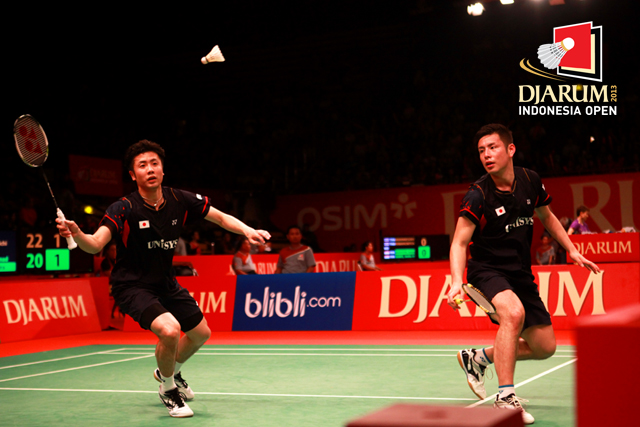 Hiroyuki Endo/Kenichi Hayakawa (Jepang) bersiap mengembalikan shuttlecock ke arah pasangan Mohammad Ahsan/Hendra Setiawan (Indonesia).