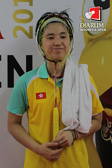 Yip Pui Yin (Hongkong) berpose dengan raketnya yang bolong usai digunakan bertanding.