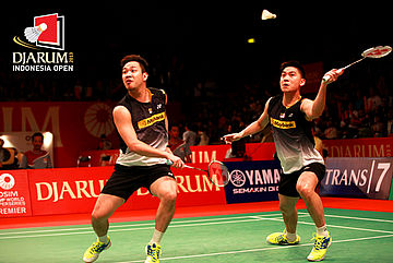 Alvent Yulianto Chandra/Markis Kido (Indonesia) melepaskan backhand ke arah pasangan Kien Keat Koo/Boon Heong Tan (Malaysia).