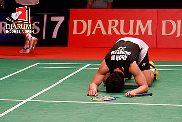 Mohammad Ahsan (Indonesia) melakukan sujud syukur setelah berhasil mengalahkan Vladimir Ivanov/Ivan Sozonov (Rusia) dan memastikan diri melaju ke final Djarum Indonesia Open Super Series PRemier 2013.