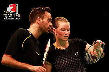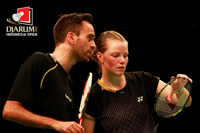 Joachim Fischer/Christinna Pedersen (Denmark) saat berbisik untuk menyusun strategi penyerangan.