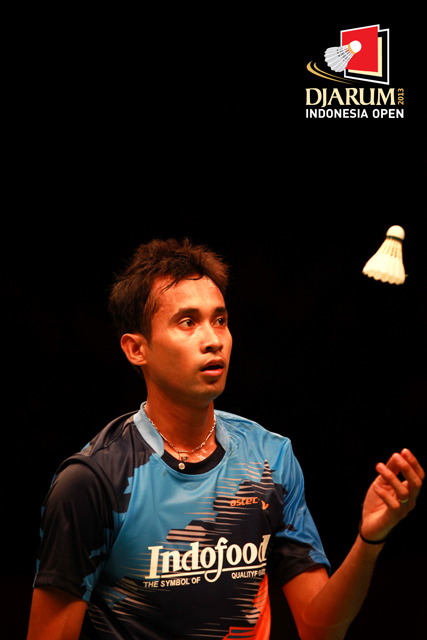 Dionysius Hayom Rumbaka (Indonesia) melempar shuttlecock yang baru saja diganti.
