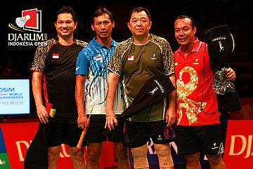 Haryanto Arbi, Sigit Budiarto, Eddy Hartono dan Trikus Harjanto berpose bersama usai menyelesaikan pertandingan "Badmin-Punk".