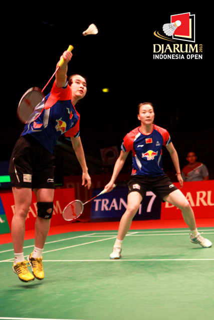 Bao Xiyin/Cheng Shu (China) berhasil menghadang serangan yang dilepaskan Tian Qing/Zhao Yunlei (China).